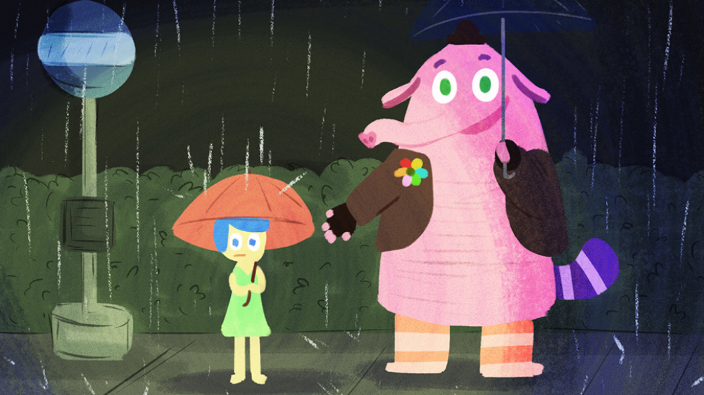 Hoerbrt, the obvious recreation of Totoro's iconic scene isn't the only homage going on here. The art style is also incredibly reminiscent of Cartoon Network's Foster's Home For Imaginary Friends.