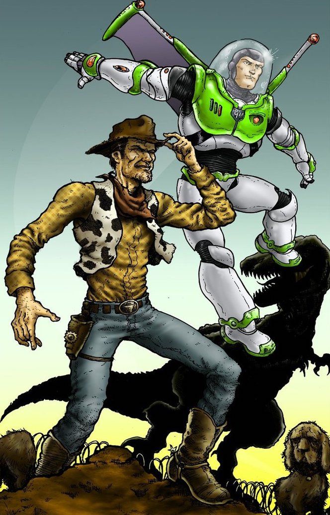 Woody is portrayed as the classic, epic cowboy of cigarette ads of the past. He's a Marlboro Man with a rugged jawline and dirty boots. Beside him, Buzz Lightyear looks shockingly similar to his animated version. He just happens to be a little more muscular and defined.