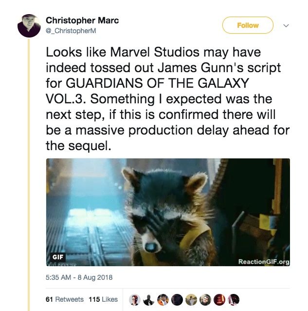 The latest reports suggest Marvel Studios has "tossed out" James Gunn's script for Guardians of the Galaxy Vol. 3. The film was due to start production in early 2019, ahead of an anticipated 2020 release, but that looks increasingly unlikely.