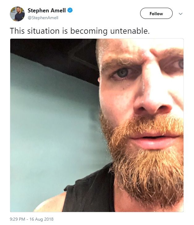 Amell gave fans a sneak peek of his Arrow season 7 look from his Twitter. Amell's face is mostly cut off in the photo, but his new and much more voluminous beard is on full display. It's not quite at the goatee level of Oliver Queen in the comics (and nearly every other visual medium) but it's well on its way. The beard is much longer than usual as Amell has always kept his facial hair shortly trimmed. Now, though, Amell's beard extends far beyond his chin. Amell doesn't seem so happy with it, captioning the photo with "This situation is becoming untenable."