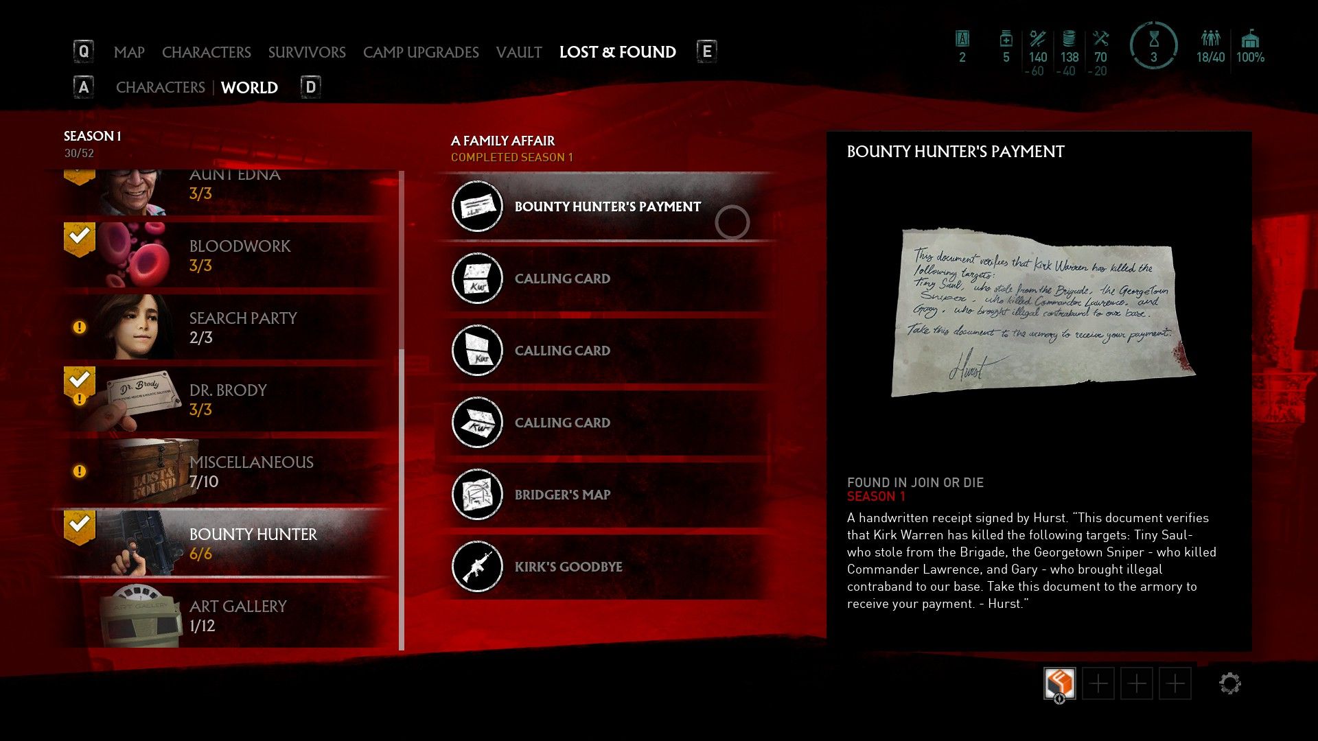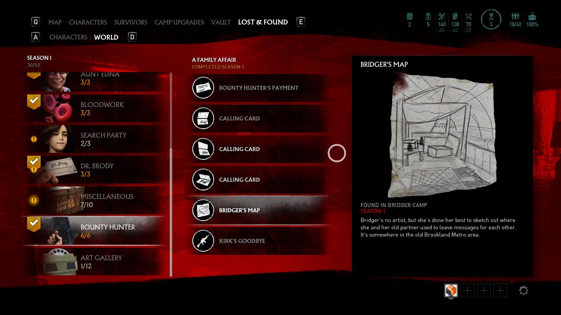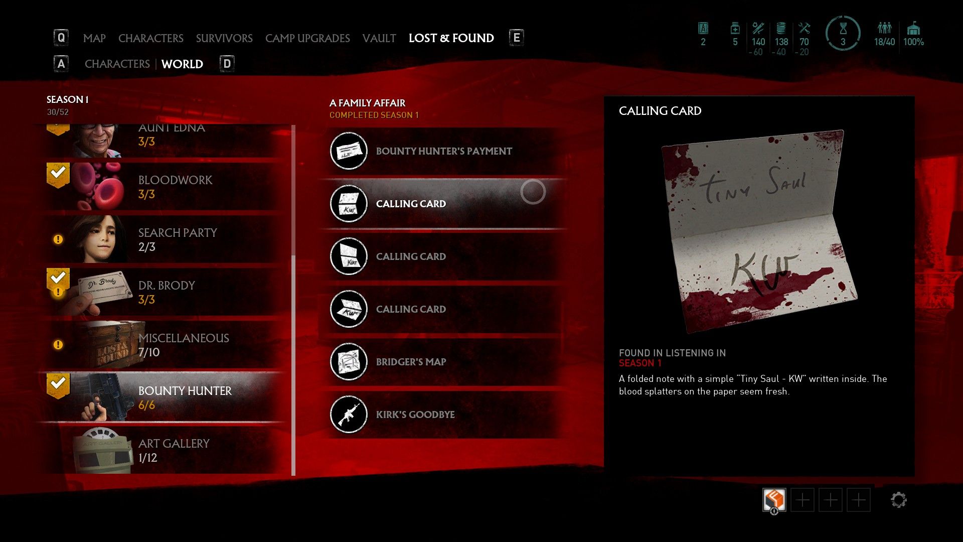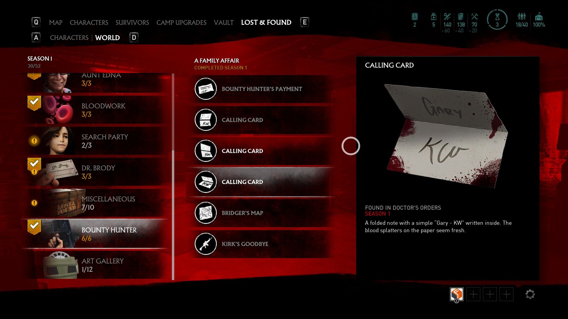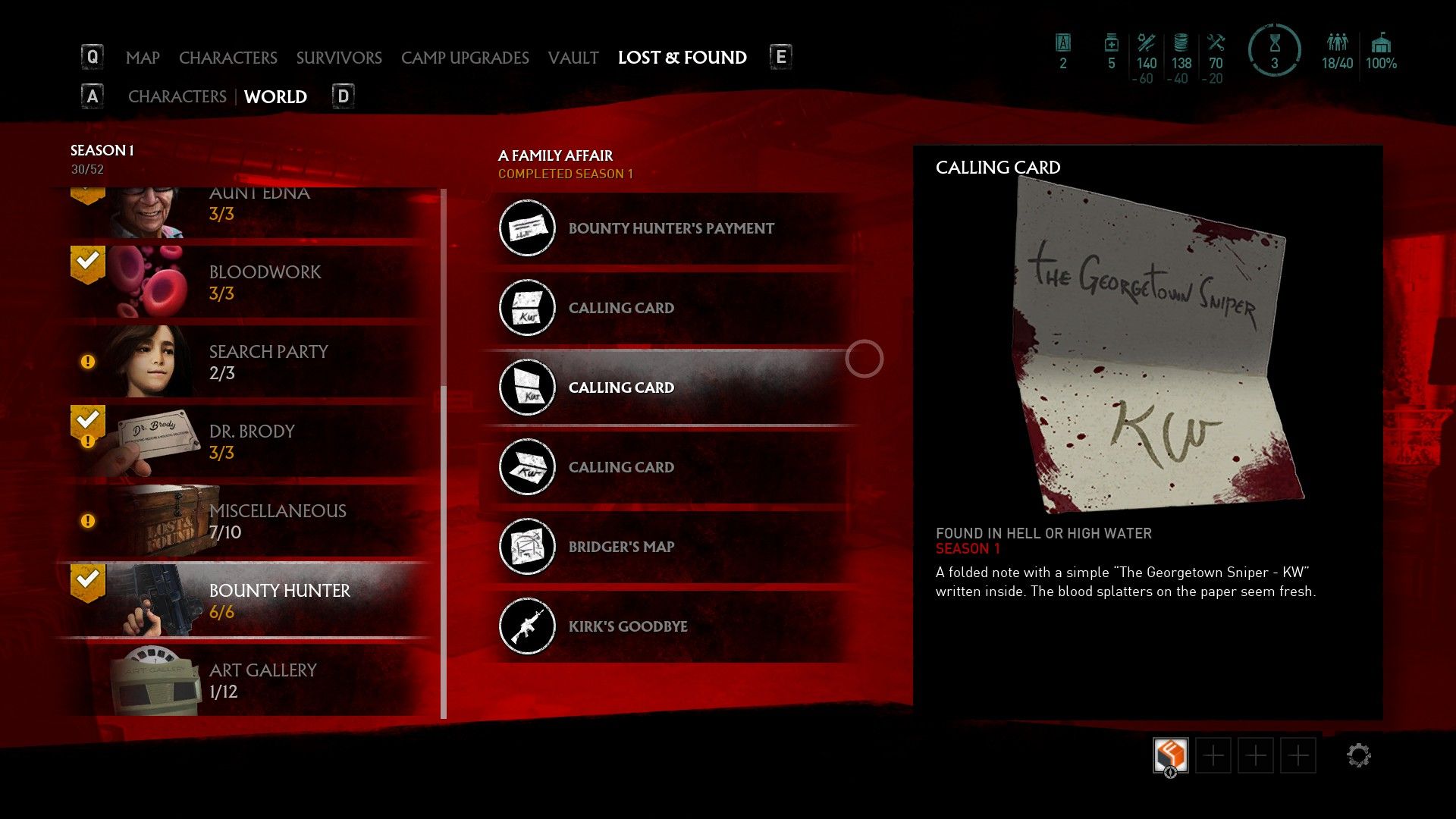 The first thing you must do is head to Eckington Camp and speak to Bridger. She's upstairs on a balcony overlooking Caleb's Truck and her dialogue can give hints of where to find the next three lore items that just unlocked, three calling cards that are located on the hunter's victims (Tiny Saul, The Georgetown Sniper, and Gary).