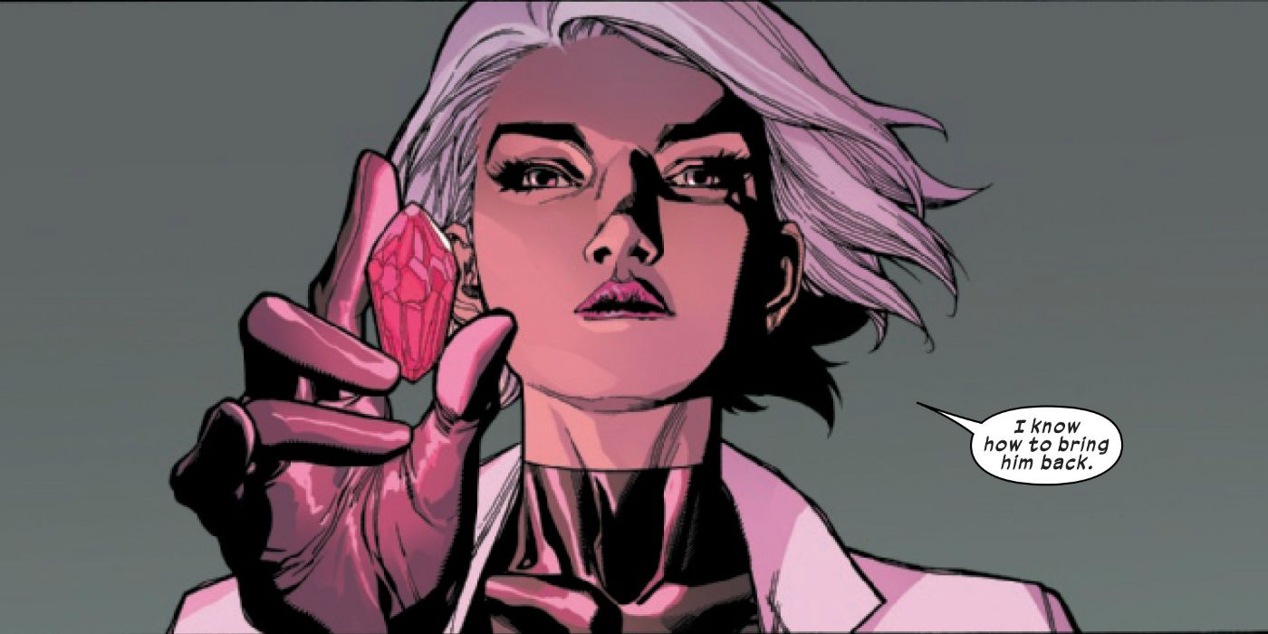 X-Men #1 ended with Dr. Gregor revealing that she knows how to bring her husband back, and brandishing a mysterious pink crystal. Visually, this doesn't correspond with anything that's been seen before in the X-Men comics; it's certainly not a shard of the M'Kraan Crystal, given those are fragments that are broken off, and wouldn't have the same kind of precise shape. It's far more likely that this is a Shi'ar memory crystal, used by Charles Xavier to store the psychic patterns of a mutant in order to clone them. It's reasonable to assume that Dr. Gregor is claiming this memory crystal stores the mental pattern of her husband, and that she then intends to use cloning to bring him back.