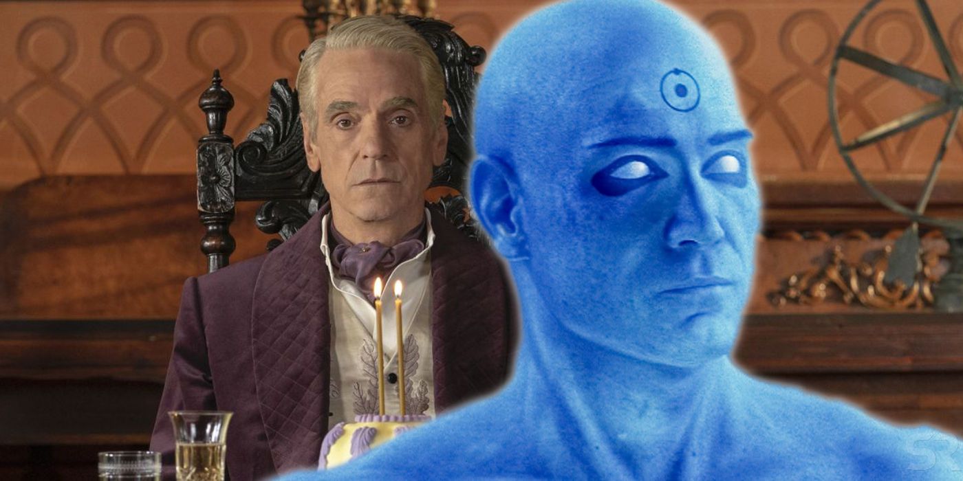 Though Watchmen hasn't explicitly declared that Jeremy Irons' is playing Adrian Veidt, the second episode, "Martial Feats off Comanche Horsemanship", leaves little doubt that Irons' mystery man is indeed Ozymandias. HBO's tie-in website, Peteypedia, contains supplemental materials about the series, including a news clipping dated September 9, 2019 titled "Veidt Declared Dead". The article states that Adrian Veidt vanished in 2012 - 7 years before Watchmen begins - but in the premiere episode, Irons' character is celebrating some sort of anniversary, complete with a special gold and purple cake, which are the colors of Ozymandias. Further erasing doubts that Irons is Veidt, he declared he was writing a play called "The Watchmaker's Son", and now that it has been performed by Phillips and Crookshanks, it's absolutely about Doctor Manhattan's tragic origin - a tale Veidt knows very well.