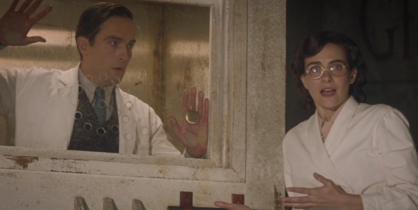 Every fan of Alan Moore and Dave Gibbons' graphic novel or Zack Snyder's Watchmen movie remembers how Doctor Manhattan was created and "The Watchmaker's Son" picks up at the story's tragic end: in 1959 at the Gila Flats research lab, physicist Dr. Jon Osterman (Phillips) and his girlfriend Janey Slater (Vickers) are desperately in love but Jon mistakenly left his father's pocket watch in their creation, the Intrinsic Field Generator. After going in to retrieve the watch, Osterman is sealed inside and is disintegrated, only to re-emerge weeks later as the superpowered being Doctor Manhattan. "The Watchmaker's Son" bombastically mocks Jon's ordeal, with Veidt in the crowd urging Crookshanks/Slater that he wants to "see those tears!" as Phillips/Osterman dies horribly. Seconds later, a nude Phillips painted blue emerges from the sealing as Doctor Manhattan, accompanied by Wagner's "Ride of the Valkyries" (a nod to Snyder's film). The play concludes with Veidt resignedly joining Phillips/Manhattan in reciting the ominous final words, "Nothing ever ends".